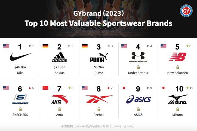 近日,品牌价值评估机构GYbrand发布了“2023全球最具价值运动服饰品牌10强榜单”(The World’s Top 10 Most Valuable Sportswear Brands of 2023)。其中,耐克蝉联“全球最具价值运动品牌”,来自德国的阿迪达斯和彪马分列二三名。前10名必一体育单中,美国占据一半,德国和日本各占两席,中国只有一家上榜。