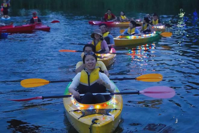 休息片刻,迎来了期待已久的荧光夜划环节。岸上常规教学后,伙伴们穿上救生衣,两两组成搭子坐上了皮划艇。皮划艇闪烁着淡淡的荧光,迎着日落晚风划行,邂逅短暂的晚霞,绕着月湖兜风,和同船的搭子随意闲聊上那么几句,耳畔的蝉鸣声声不绝,松弛、畅快、愉悦。