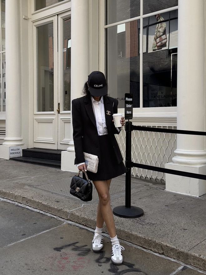 可以根据正式程度,选择运动风单品融入的比例,比如小面积的运动鞋、棒球帽,是经典的商务休闲风搭配。