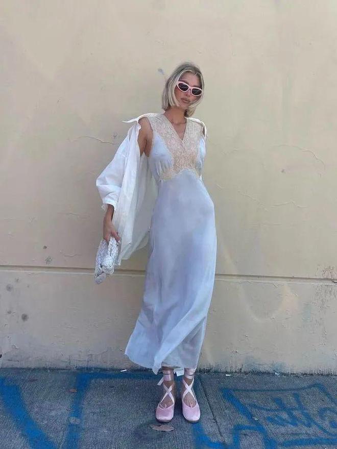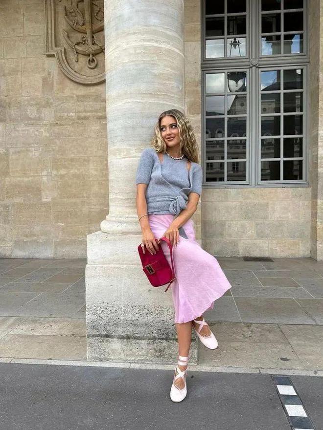 像散开的裙摆,软软糯糯的针织,温柔的粉色系、莫兰迪色系,都很适合搭配芭蕾风单品。