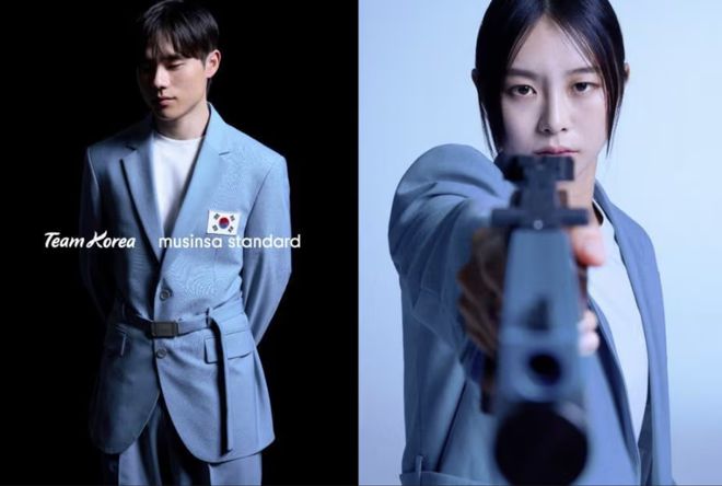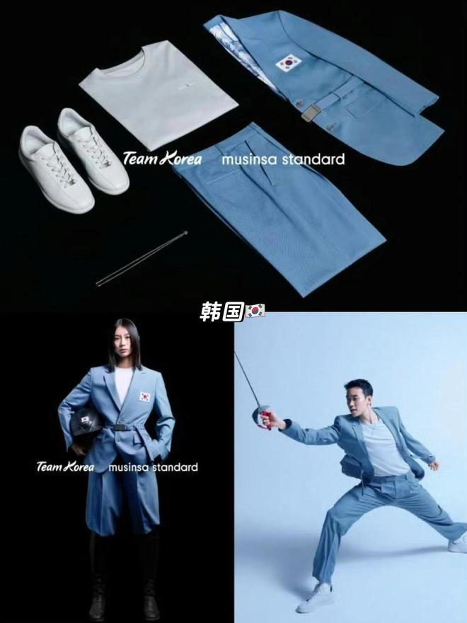 韩国队队服由韩国休闲品牌Musinsa Standard设计。此次的开闭幕式制服采用浅蓝色配色。Musinsa Standard解释道:“我们选择了代表东方的宁静蓝色,象征着青春的活力和进取精神。希望韩国队能在各国选手中熠熠生辉。”制服上衣和裤子采用了夏季羊毛面料。西装内衬的设计灵感来自青花瓷。此外,制服还特别设计了一款时尚腰带,灵感来源于传统的韩式宫廷腰带。制服的其他组成部分包括采用凉爽、吸湿面料制作的T恤和跑鞋风格的白色运动鞋。运动员还将收到带有太极图案的银色吊坠项链作为配饰。“Team Korea”标志刻在西装领内侧、T恤、长裤以及运动鞋的鞋垫上。