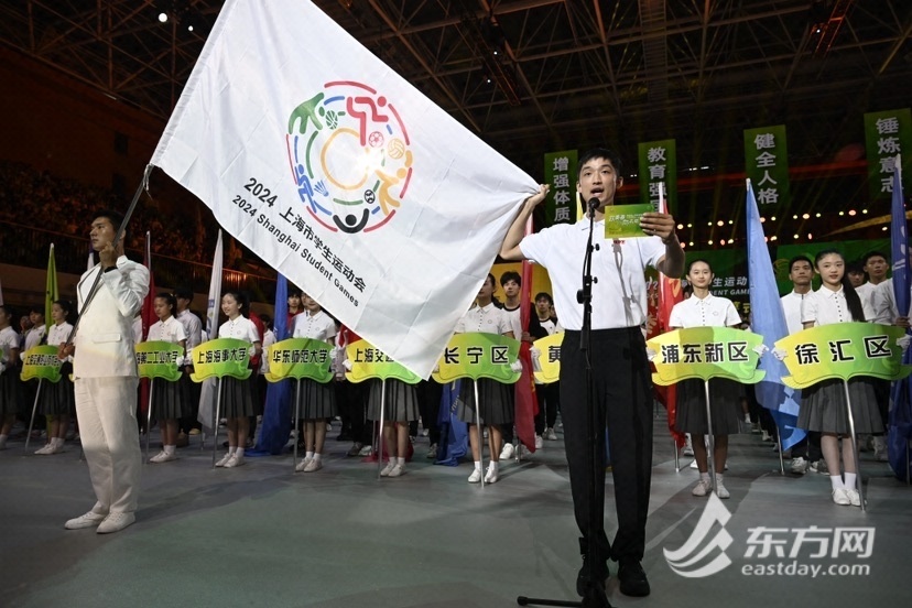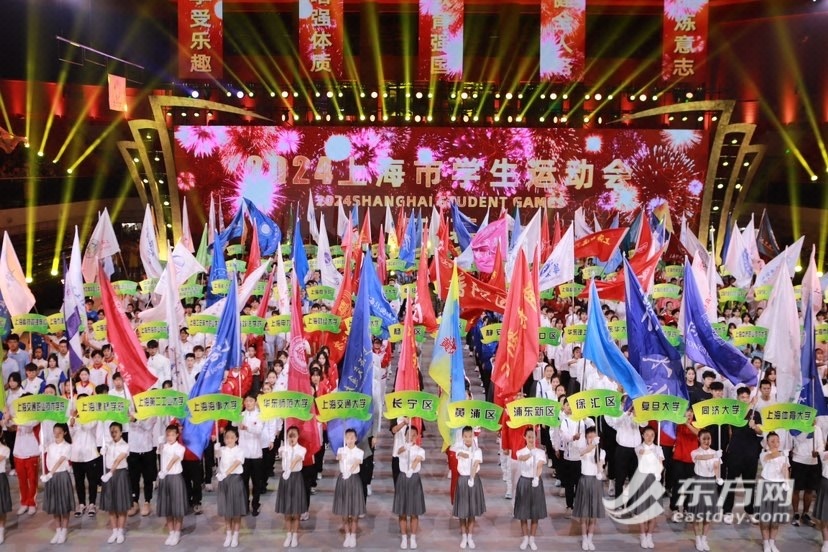 下午2时,2024上海市会开幕式开始,护旗手护送中华人民共和国国旗、2024上海市会会旗入场!随后,来自16个区、55所高校和47所中职校的共118个代表团方阵身着整齐服装、迈着矫健步伐依次入场,以昂扬姿态展示出新时代青少年学生昂扬向上的精神风貌。