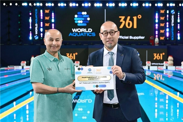 2月14日,中国领先的体育用品品牌361°与世界游泳联合会(World Aquatics,下称:世界泳联)正式签署合作,在签约期内,361°将作为官方体育服饰供应商,为世界泳联旗下赛事的顺利举办与发展提供支持。世界泳联主席侯赛因·阿尔-穆萨拉姆(Husain Al-Musallam)、361°品牌管理中心总经理郑业欣等嘉宾出席签约仪式。