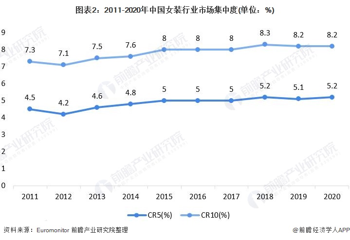 近10年,中国女装行业集中度不断上升,2020年前十大品牌合计占女装市场的比重为8.2%;前五大品牌合计占女装市场的比重为5.2%。但整体来看提升速度较慢,同时集中度非常低。我国女装行业长期呈现集中度低的分散竞争格局,这主要是由于消费者对服装的差异化需求为细分风格和小众时尚品牌提供了生存空间,尽管竞争环境的日益激烈,但后起之秀仍有赶超空间。