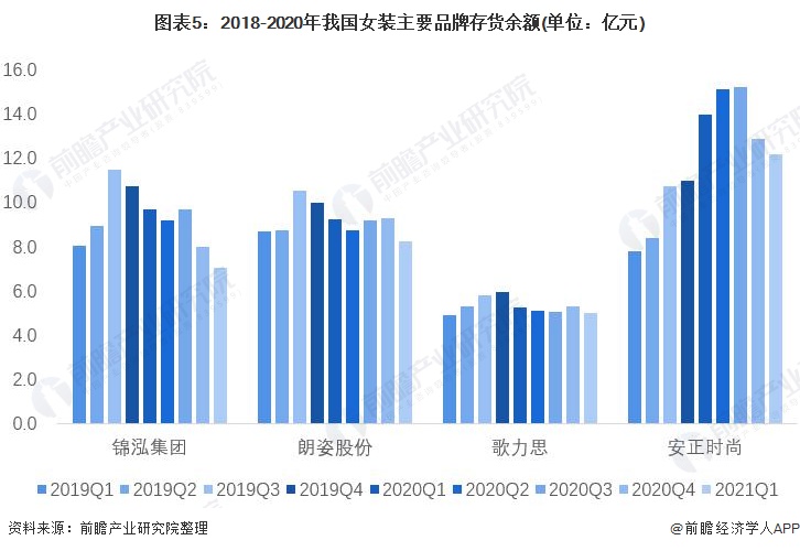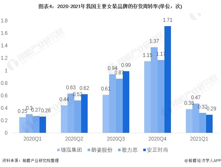 从2020年主要女装品牌的存货周转率情况来看,锦泓集团存货周转率较低,2020年末存货周转率为1.15次。此外,截止2020年末,朗姿股份存货周转率为1.37次;歌力思为1.17次;安正必一体育时尚存货周转率最高,为1.71次。整体看来,女装行业存货周转率偏低,存货变现能力有待提高。