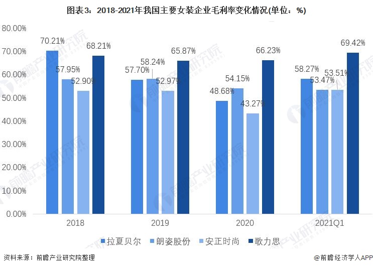 2018-2020年,我国女装市场毛利率呈现波动态势,但都处于较高水平。2018年至2019年,国内主要女装品牌的毛利率均维持在50%以上。2020年,四家女装企业毛利率均出现不同程度下滑,拉夏贝尔下降到48.68%、朗姿股份下降到54.15%、安正时尚下降到43.27%、歌力思下降到66.23%。2021年第一季度,在疫情好转后,四家企业毛利率均有上升。