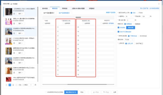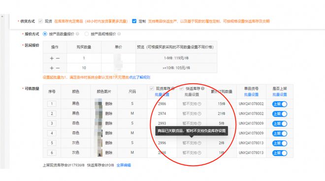 ②点击销售信息,可以设置各个规格的快返库存,如果无法48小时内发货,建议把现货库存改为0(可以设置全部相同)