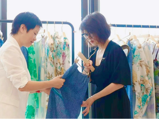 2024年8月21日,玖姿JUZUI创意总监王陶在品牌设计工作室与到访的媒体朋友畅谈了色彩、面料、花和中式服装配色……和她对中式的理解、感受和表达,以及展示了她历经数月发掘的经过非遗技术认证的新作品。