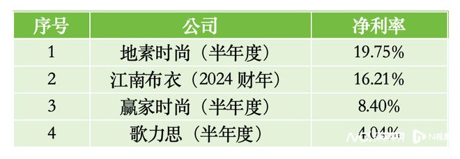 2024年上半年,地素时尚净利率19.75%。2024财年,江南布衣的净利率在16.2%。两者排名靠前。其余赢家时尚、歌力思上半年的净利率则相对靠后,分别为8.4%和4.0%。