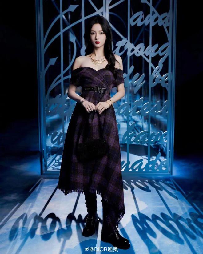 一身2025早春成衣系列紫色不规则格纹裙亮相秀场,搭配黑色卷发,立显东方美人的外在精致与矜贵,以及内心的那份自信与坚定。