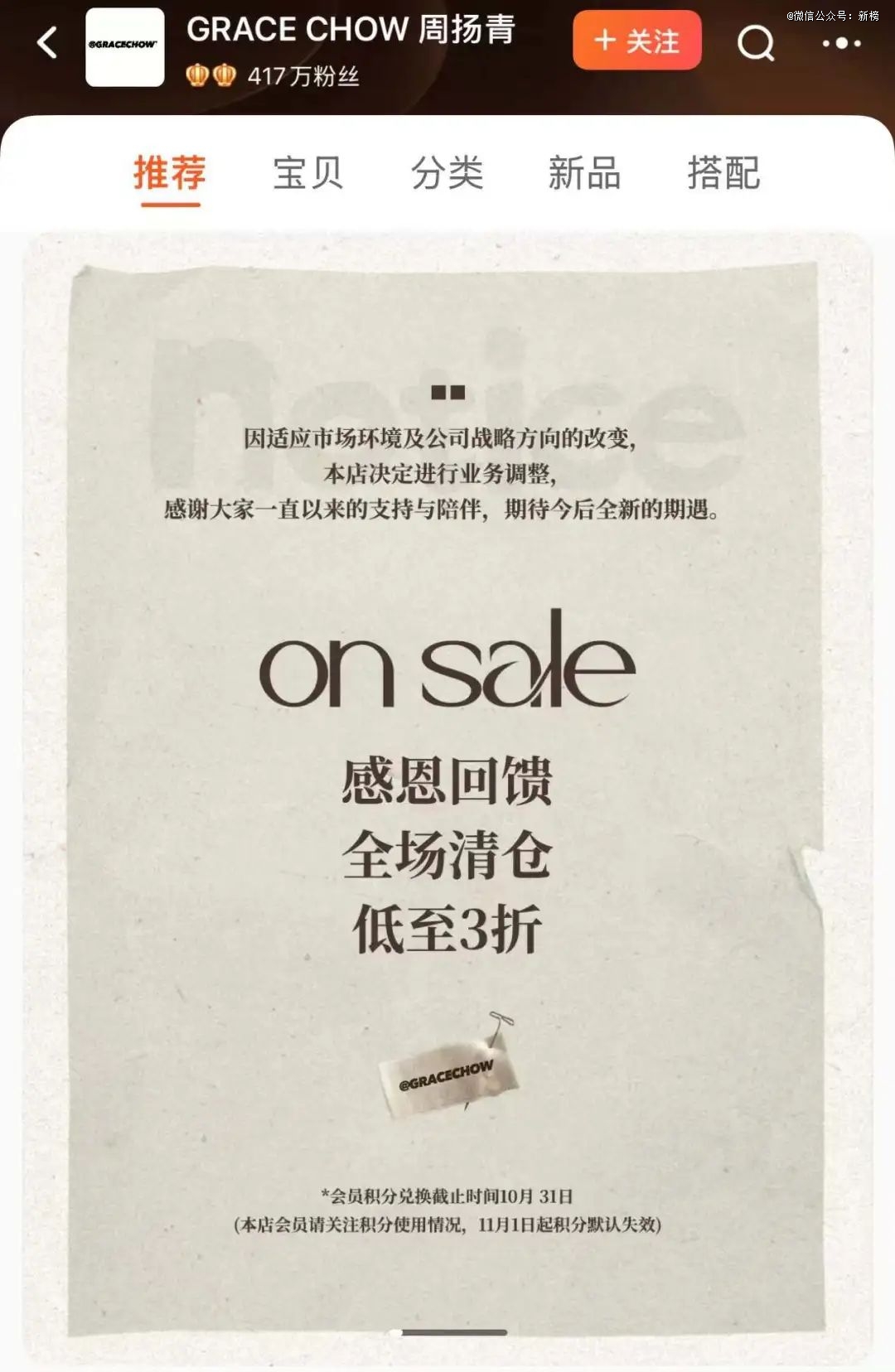 近期,网红周扬青的淘宝女装店“GRACE CHOW周扬青”发布全场清仓的通告,称“因适应市场环境及公司战略方向的改变,本店决定进行业务调整”。