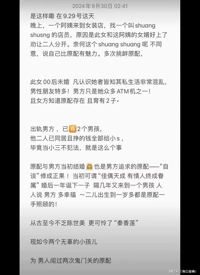 当然,这阿姨也不是无缘无故来找她,阿姨称:自己的女儿与女婿已经必一体育结婚多年,已经有了两个孩子,家庭很美满,希望这名叫“双双”的店员高抬贵手,不要再做小三,插足女儿与女婿的婚姻。