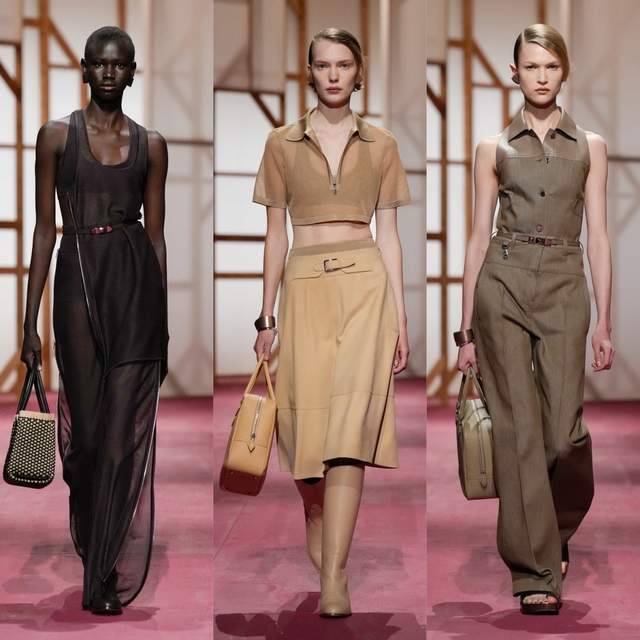 风格,是感官的盛宴,是触觉的愉悦,结合物质本身的纹理与质感。木底凉鞋轻巧起步,浅黄褐色Barénia皮革托特包如影随形,几何耳环呼应点缀于皮革包袋的饰片设计。 紫茉莉色丹宁唤起生机。柔软皮革流转于静谧绿色与米色调:驼色、肉桂色、路易波士红茶色、牛皮纸色。丰盈表面勾勒轮廓,编织故事。 轻盈与精致并存,实用与美学交织,女性气质游走于温柔与力量、诱惑与坚韧之间, 可观、可感,亦可驾驭。功能,如同点金术般,经过重重演绎,直至融入感官之中。