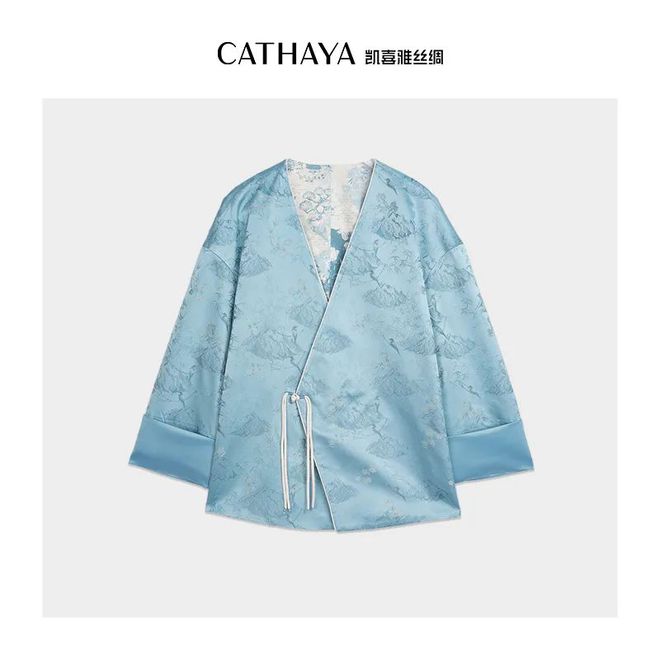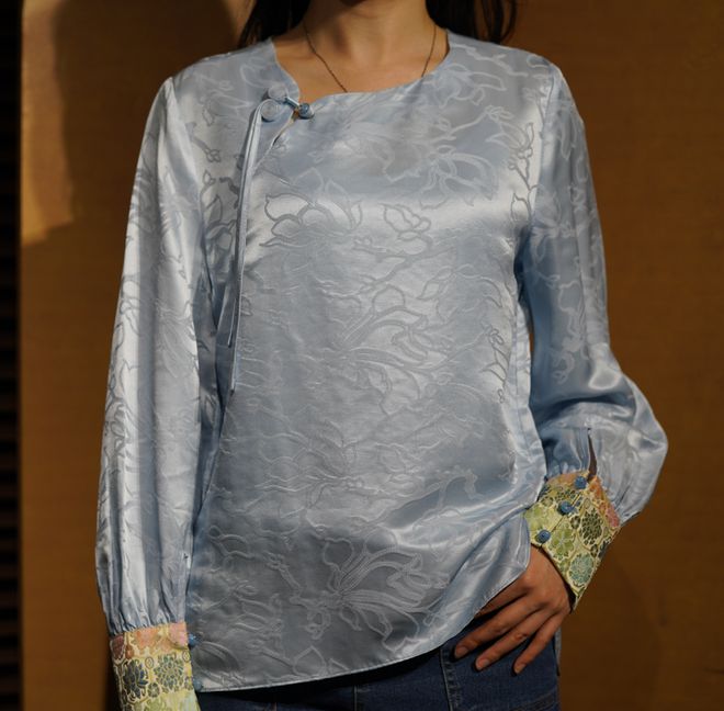 上身优雅自带贵气,对襟中式版型,简约不挑身形。宽松设计,搭配了垂坠感真丝丝绒面料,更显瘦。袖口搭配粉蓝色的花萝,更显古典韵味。
