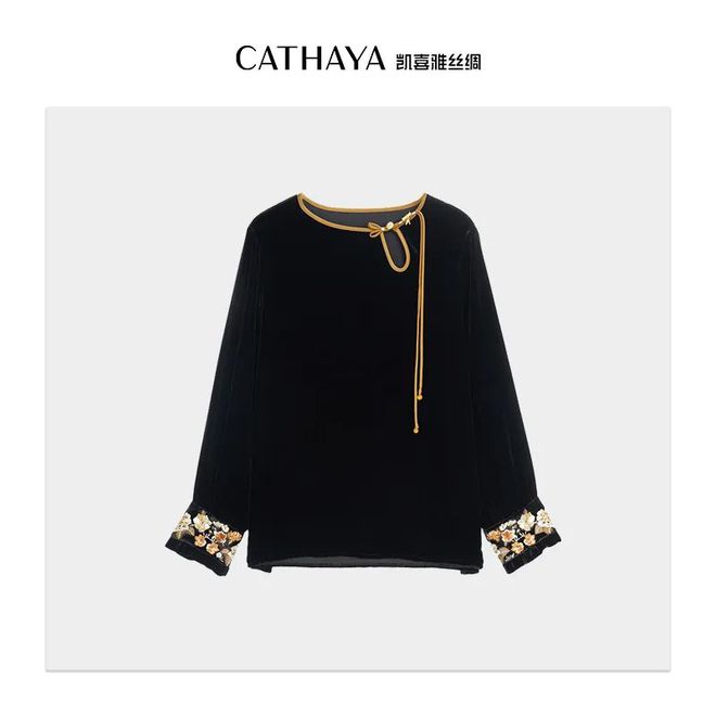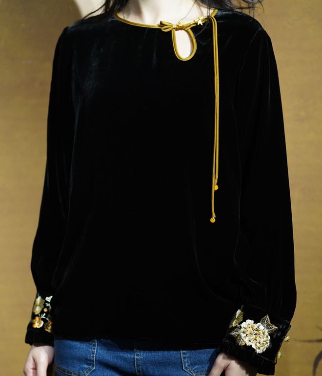 刺绣丝绒上衣,桑蚕丝手感细腻,亲肤丝滑,小细节展现出设计感。合身立体的版型,藏肉显瘦,且好穿易搭,正式或休闲场合都是很好的选择。