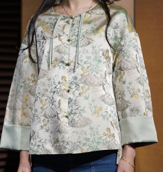 这件在现场大放异彩,面料采用宋锦“春和景明纹样”,蕴藏花鸟竹山石,古代文人书画多为描写花鸟山竹,花鸟笔墨间,岁月画意生。