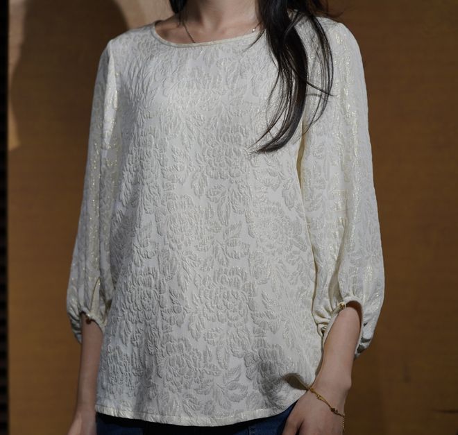 冠乐绉工艺,不会皱的桑蚕丝,加了金丝线,高级别致。这件圆领真丝上衣剪裁高级简约,搭配牛仔裤、阔腿裤、裙子都高级。