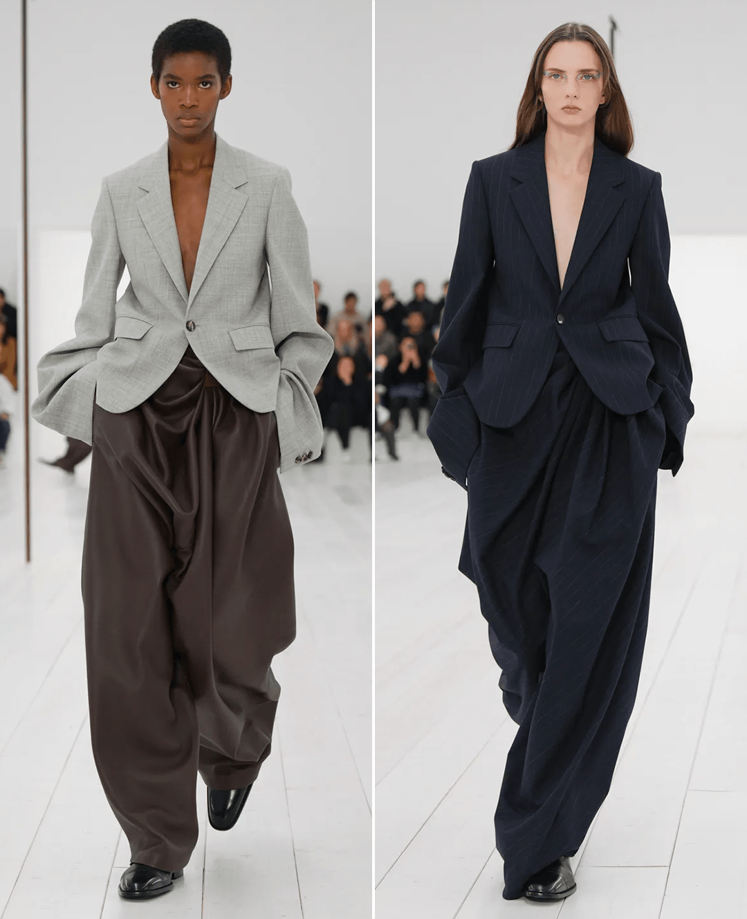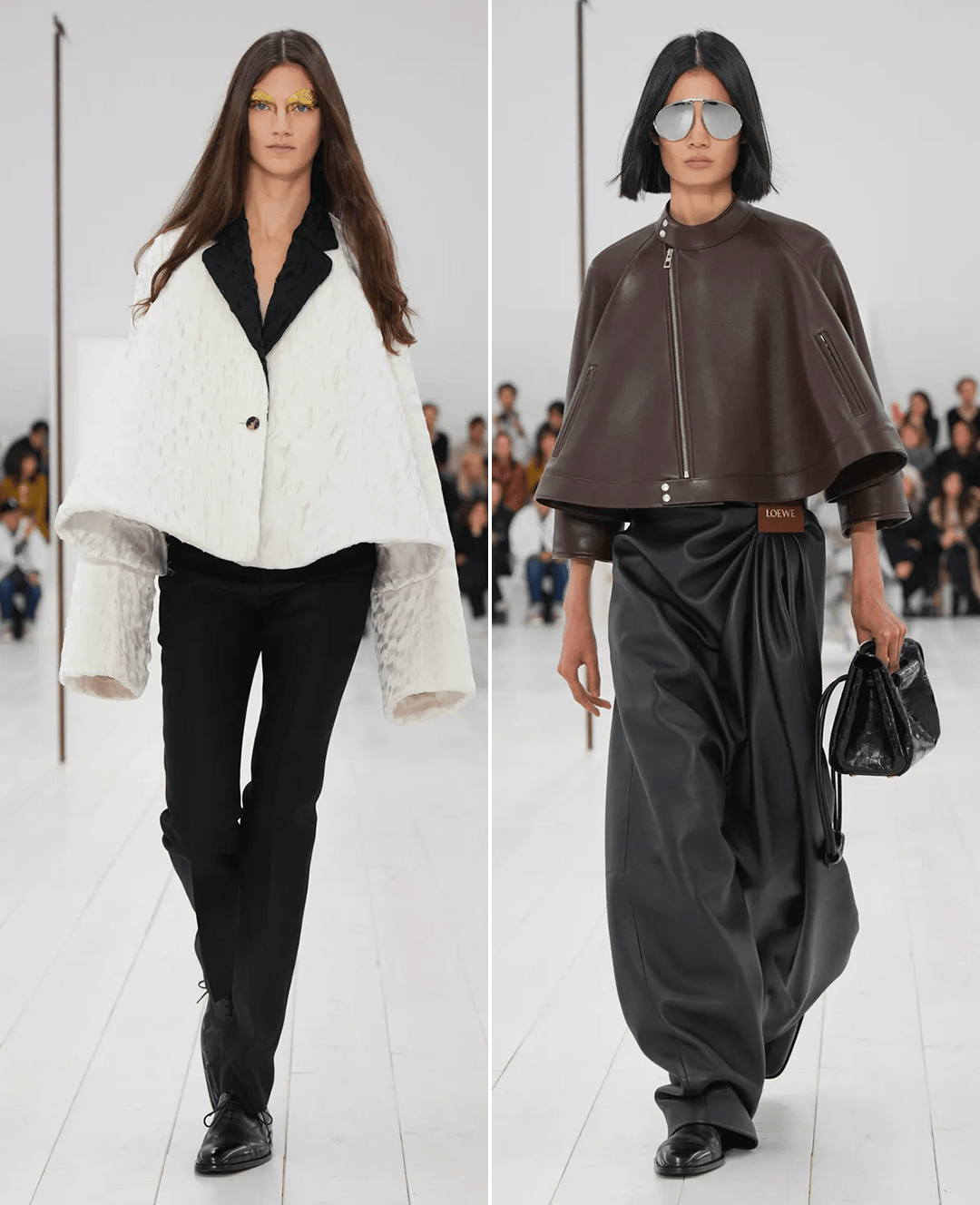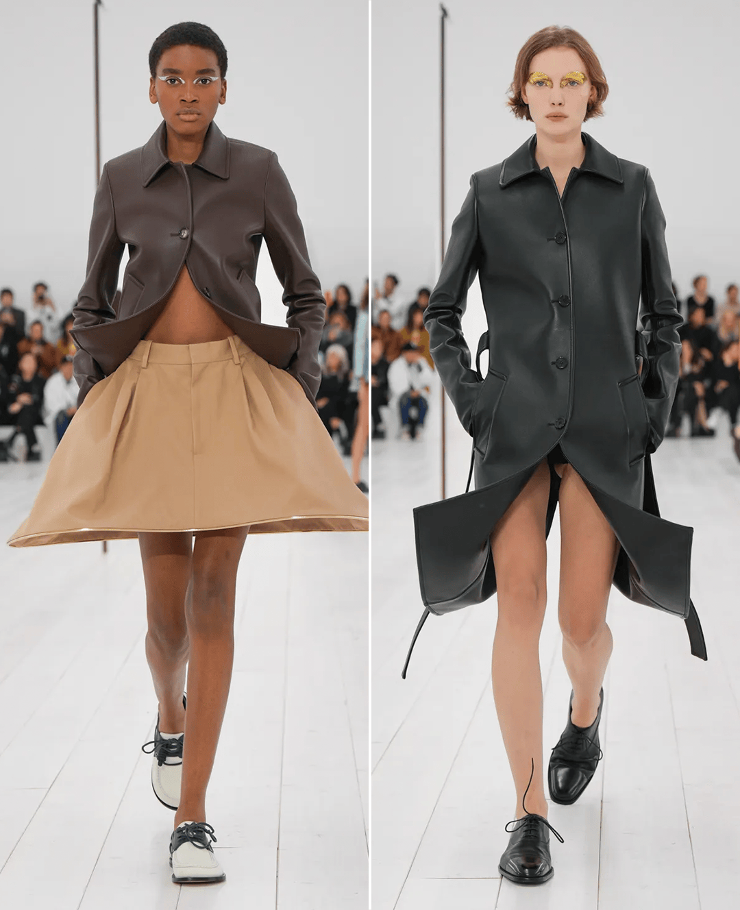 A 字轮廓贯穿在很多 LOOK 里,西装、皮夹克都如裙摆般散开,仅靠面料和剪裁来实现立体廓形,展现了品牌精湛的制衣工艺。 ▼