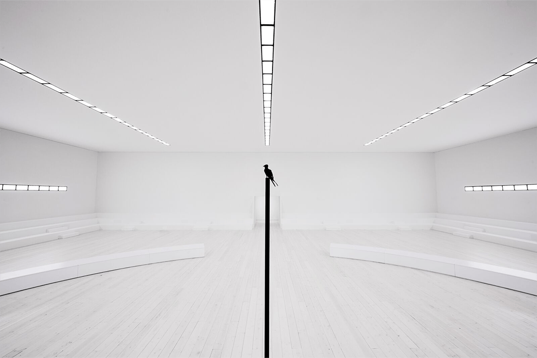 秀场内的布置简洁纯净,整体呈圆形,中心矗立着一件来自英国艺术家翠西-艾敏的艺术作品:一只青铜铸造的小鸟,栖息在细长的柱子上,脆弱与坚韧并存。▼
