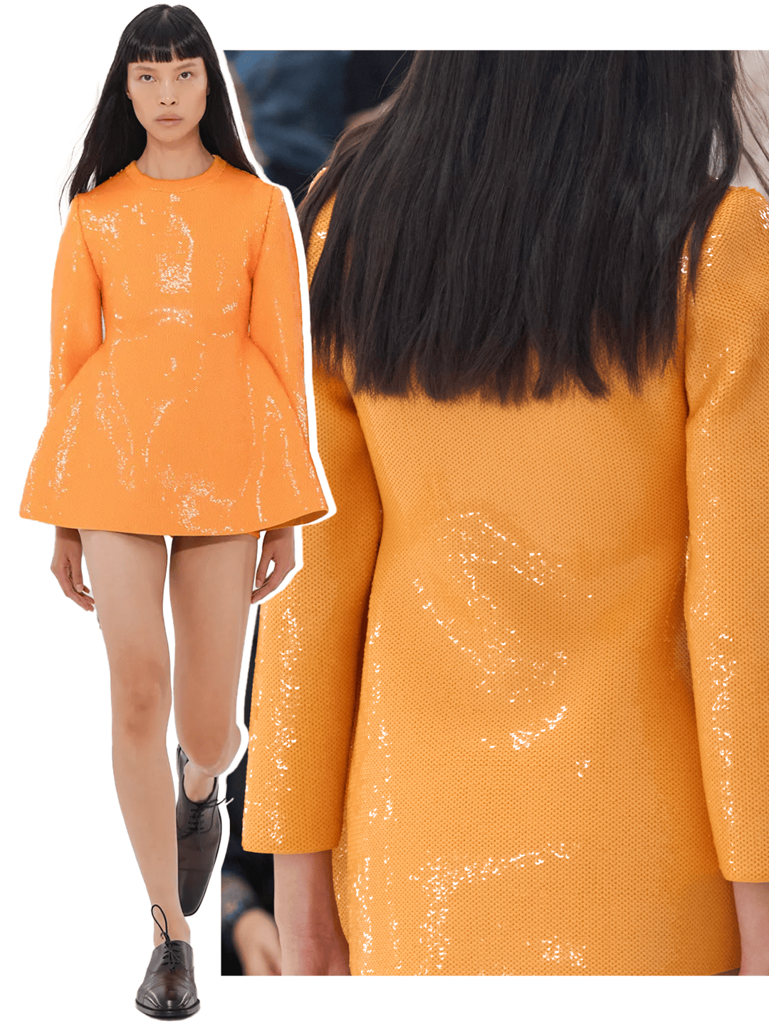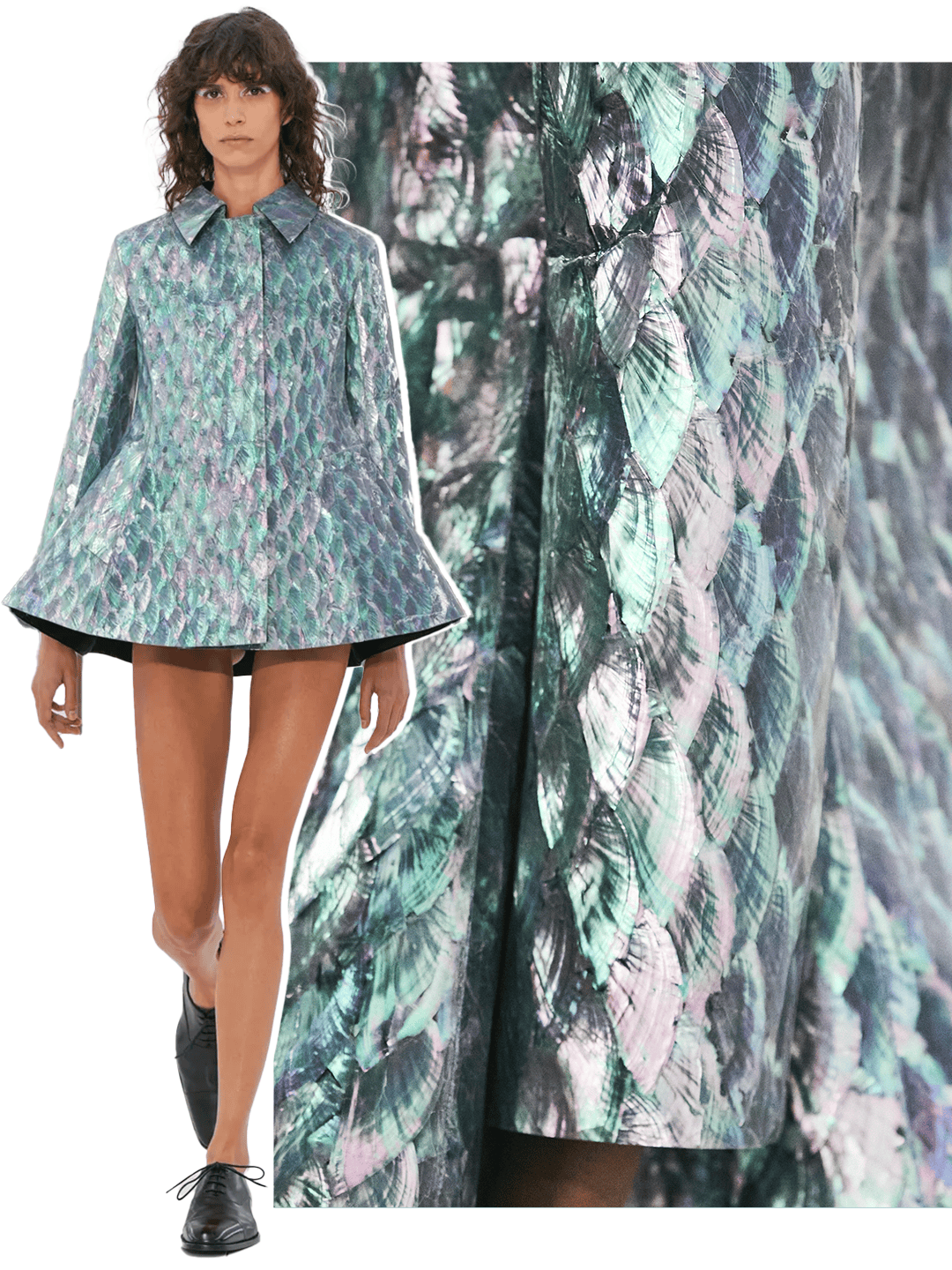 A 字型连衣裙,轮廓像一条缩小缩短的蓬蓬连衣裙,有些古灵精怪,闪闪发光的珍珠贝母面料又增添了礼服般的隆重感。▼