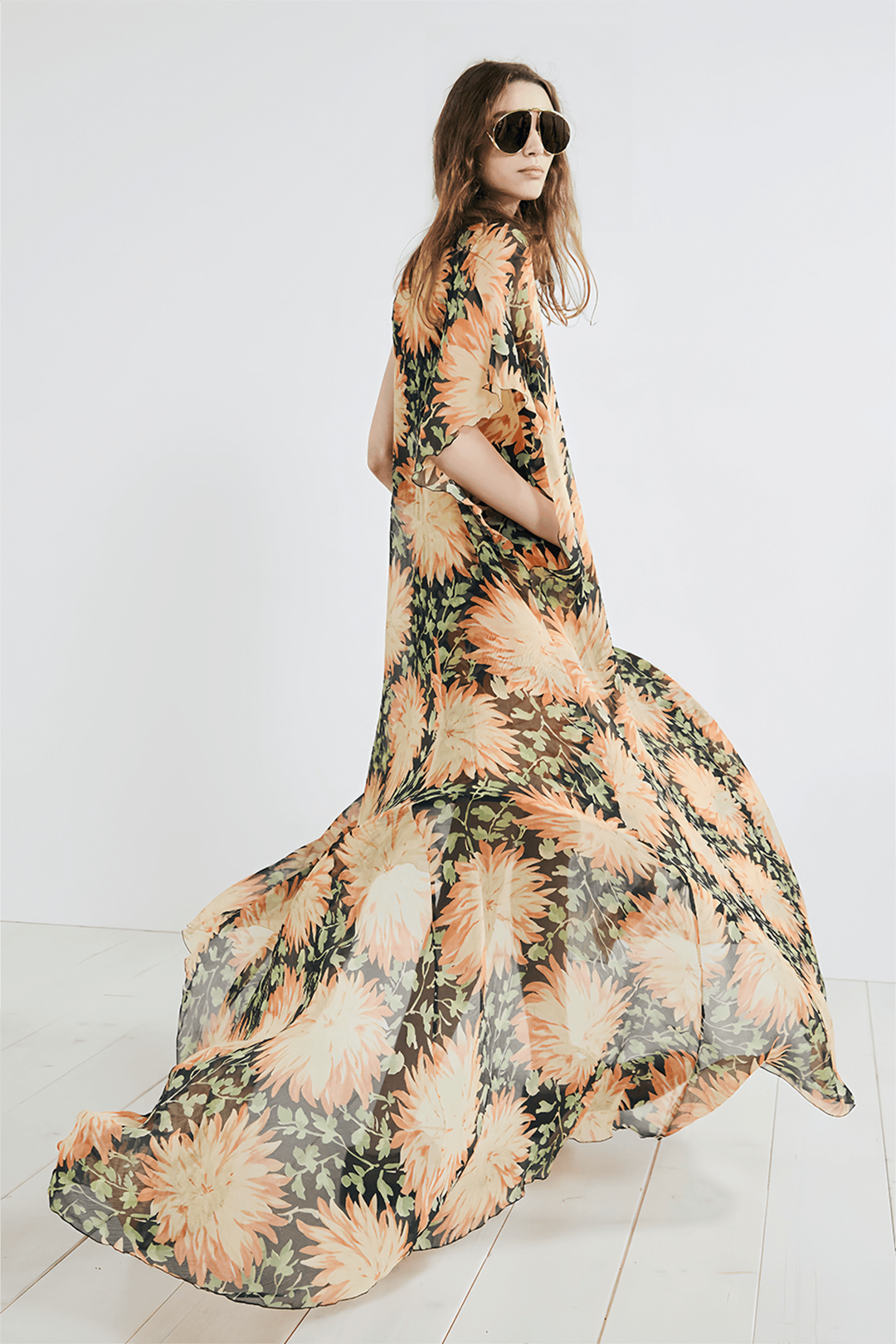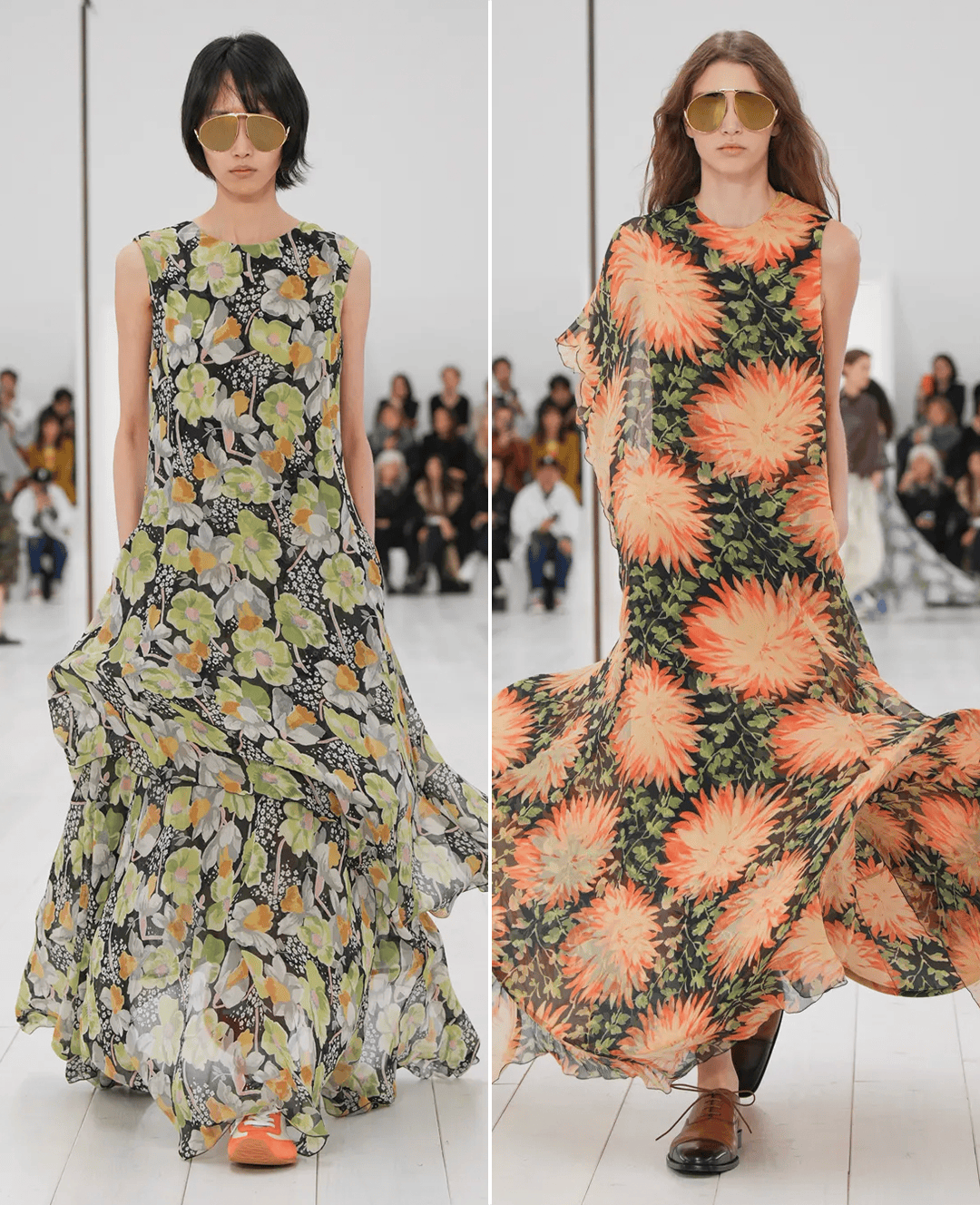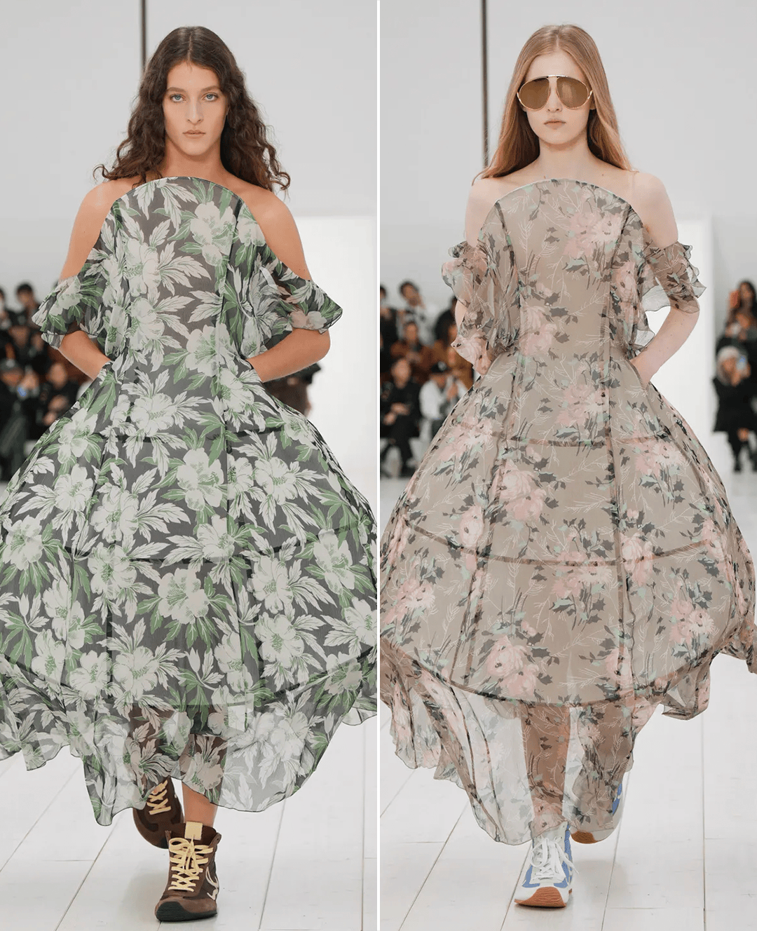 伴随着优雅的古典音乐,大秀开始。风格最鲜明的一系列 LOOK ,是带有鱼骨裙撑的飘逸纱裙。明亮的花朵印花带来春夏度假氛围,廓形再现法国黄金年代的古典礼服轮廓,但略去束腰、强调裙撑。▼