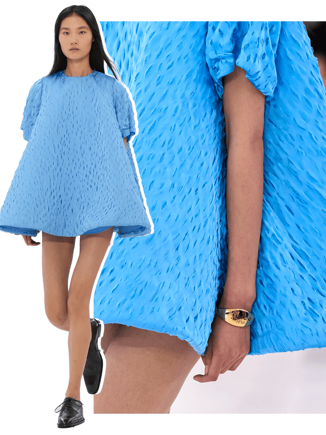 在简洁利落的 A 字版型上,面料的肌理更加凸显。丝绸“洞洞裙”以俏皮衣型和破洞设计打破了绸缎的精致华丽。