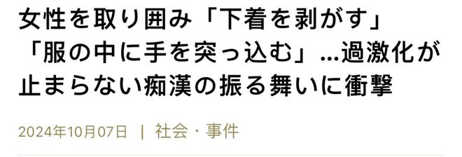 近日在JR埼京线更传出,有女性遭到狼手摸,甚至还有女性的内衣直接被拉下来。有不法分子在网上召集「同爱好人群」,一起在电车上包围女性,伸出咸猪手。由于日本目前未祭出有效对策,导致许多女性乘客受害。但是日媒报导指出就算加强警备防范,这种行为也难以根除。